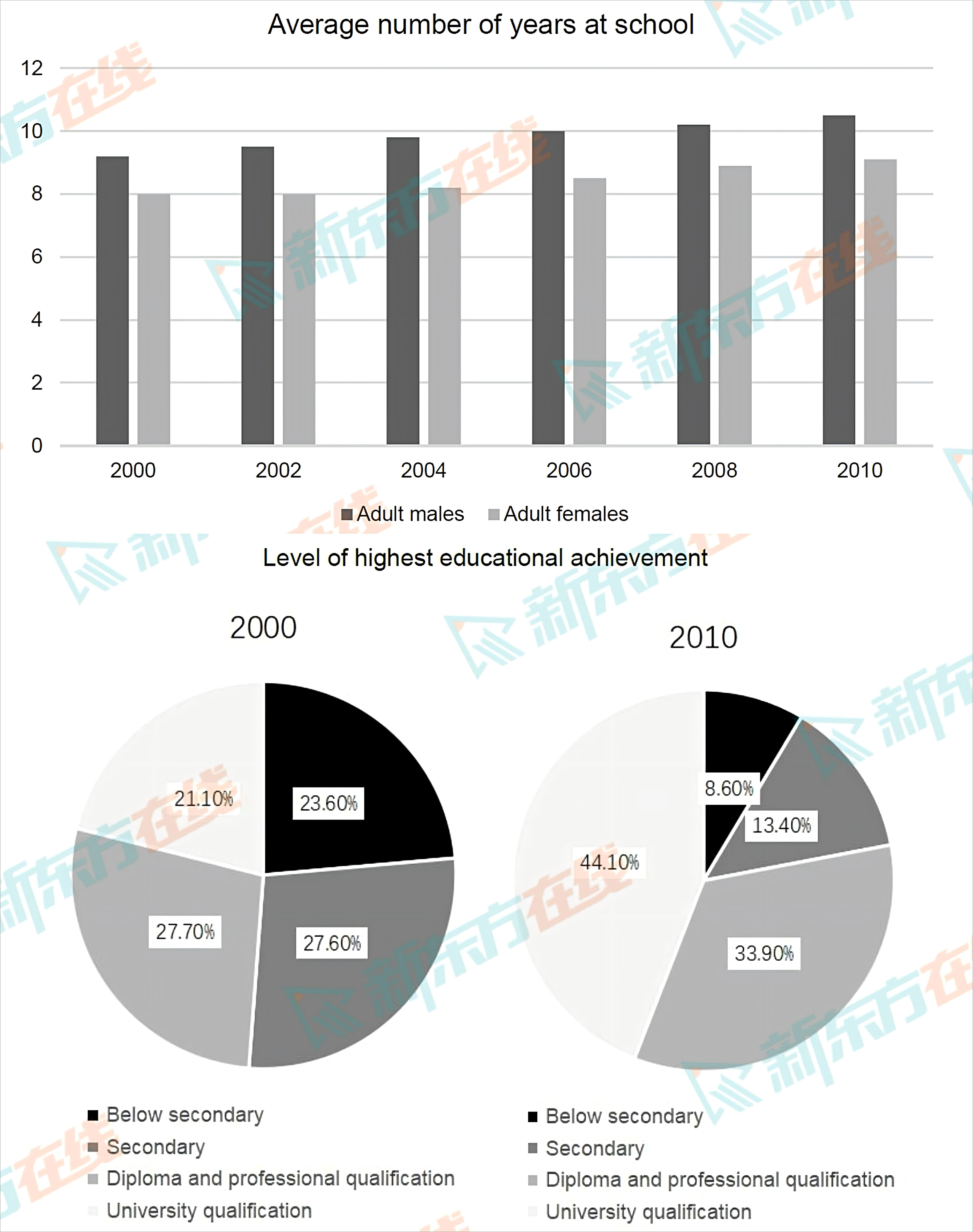 The bar chart below gives information about the average number of years at school of adult males and females in Singapore, and the pie charts show the level of the highest educational achievement.