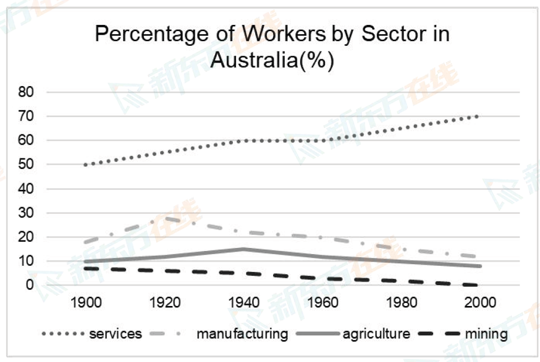 The graph below shows the proportion of workers employed by four different fields in Australia from 1900 to 2000.