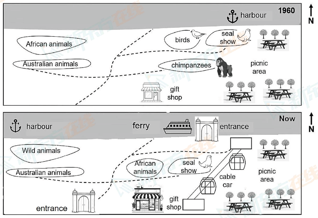 The maps below show changes that have taken place at a zoo in Australia between 1960 and now.