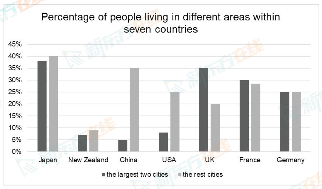 The chart below shows the percentage of population in the largest two cities and the rest of cities in seven countries in 2017.