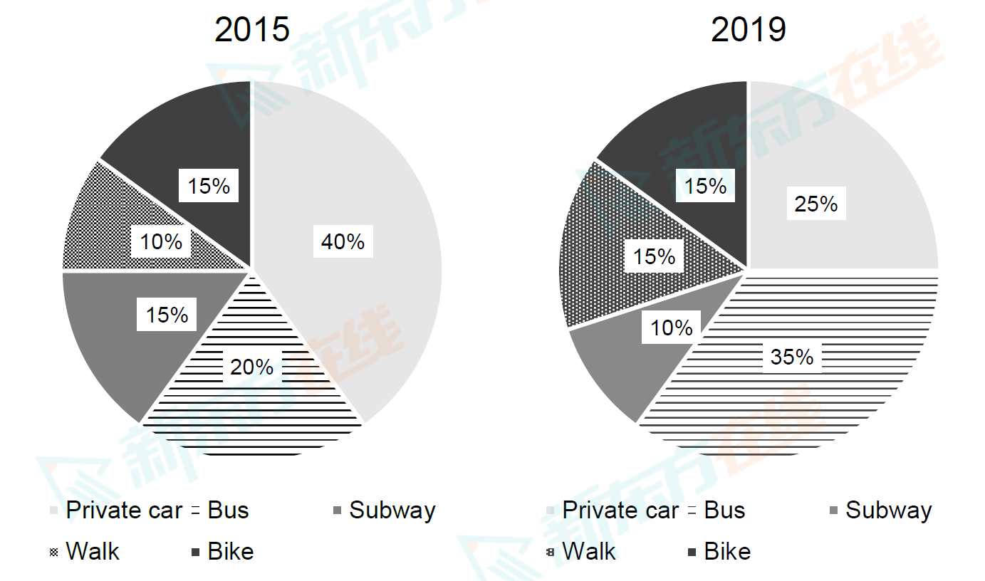 The charts below show the percentage of university students using different modes of transportation to reach campus in the UK in 2015 and 2019.