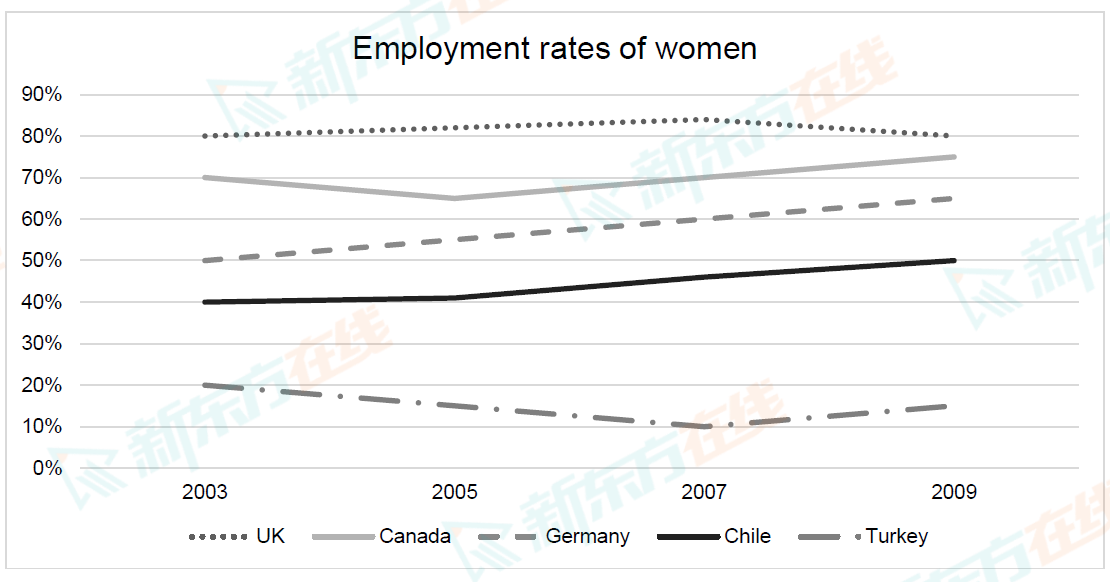 The graph below gives information about the percentage of women aged 15-64 in employment between 2003 and 2009.
