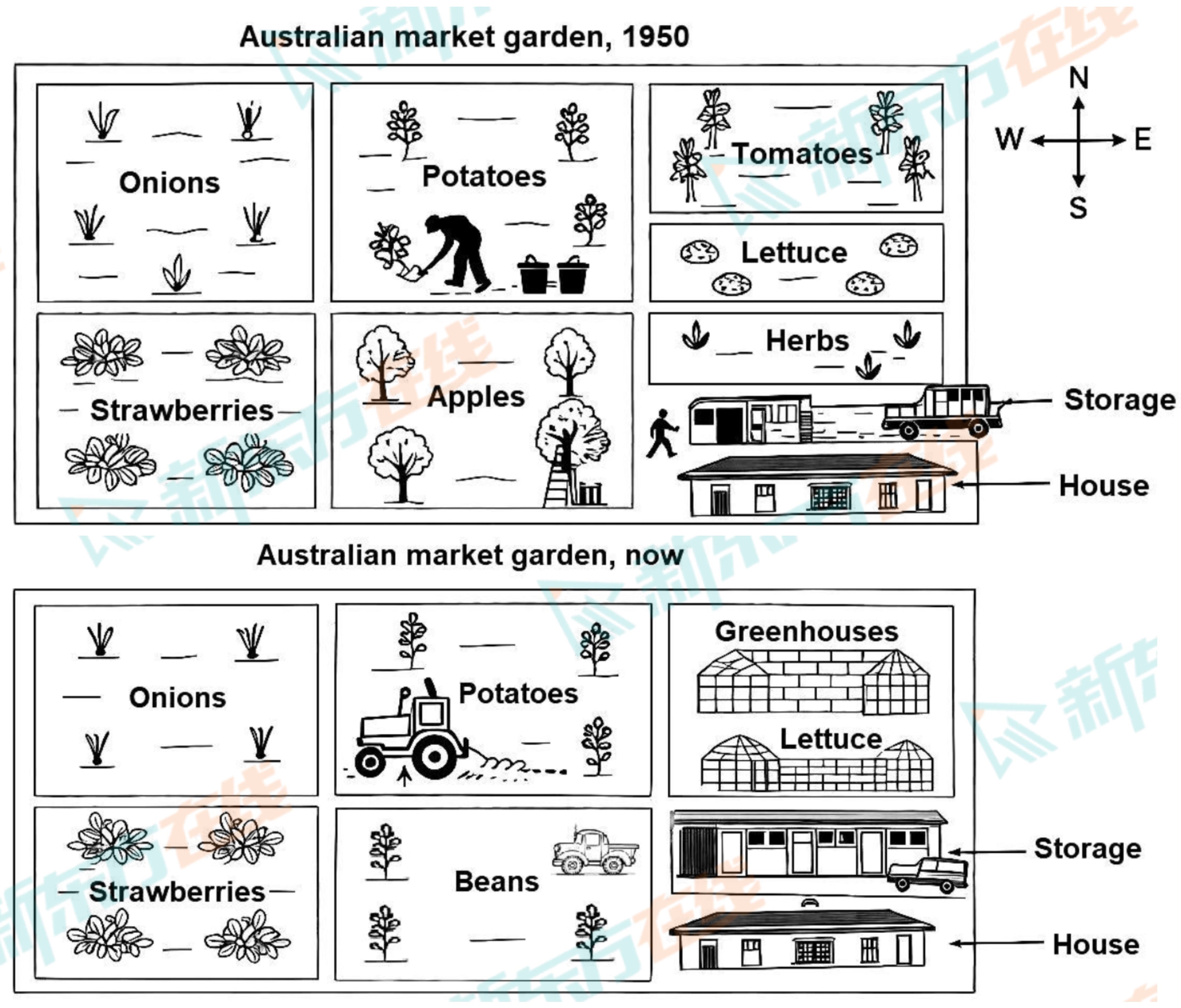 The plans below show an Australian market garden in 1950 and now.