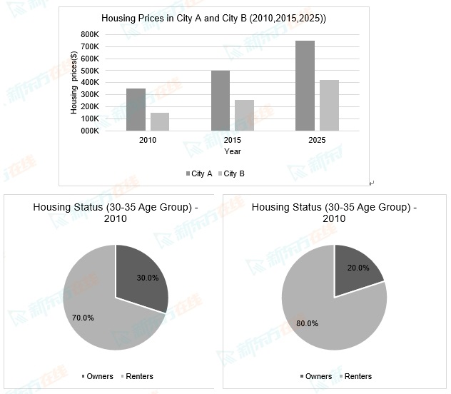 The first chart shows the average housing prices in two cities in one country in 2010 and 2015, with projections for 2025. The second chart shows the percentage of people aged 30-35 who owned a home in 2010 and 2015.