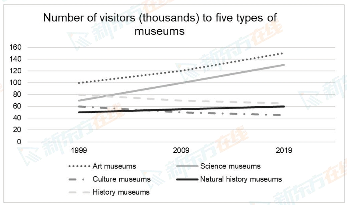 The graph below shows the number of visitors to five different types of museums in the UK from 1999 to 2019.